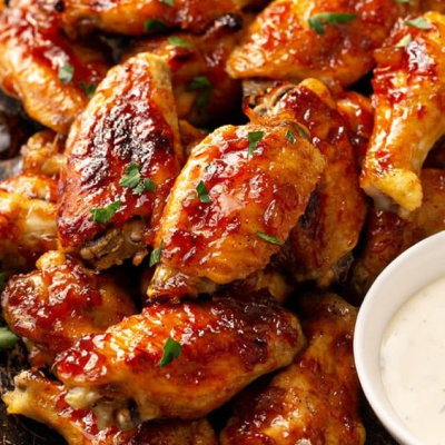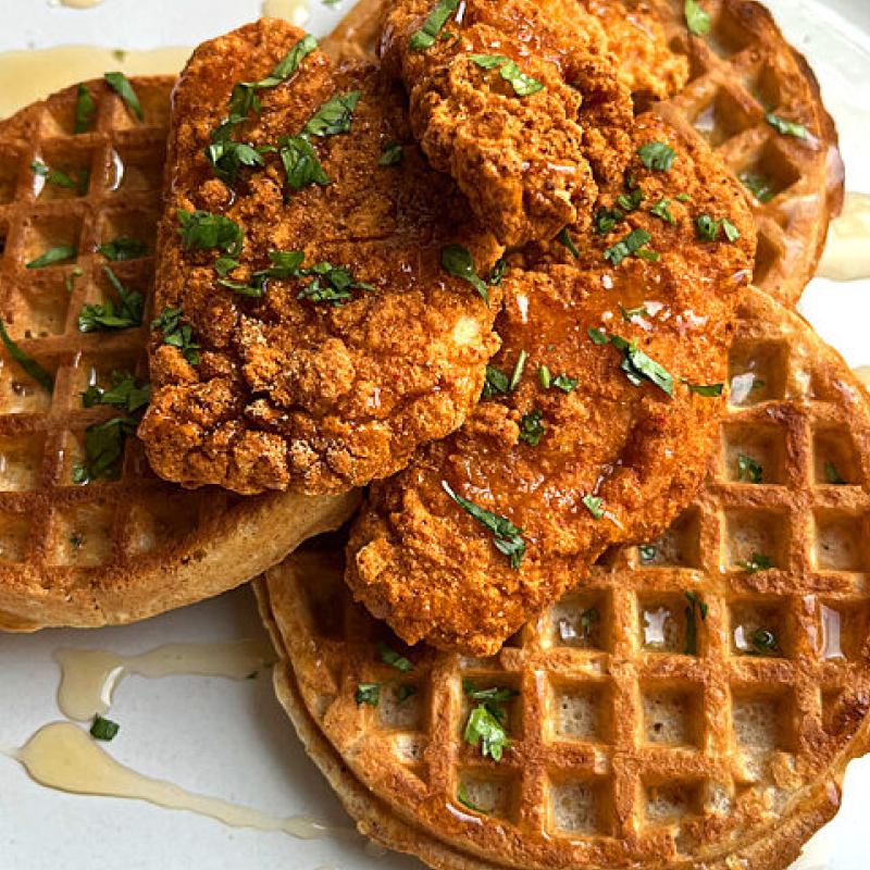 Chocolate/buttermilk waffles, crispy chicken, baked beans, scrambled eggs, dipping sauce and syrup