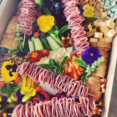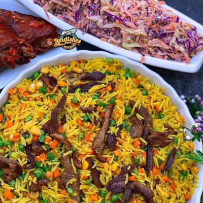 Jollof rice, prawn fried rice, chicken salad, turkey/chicken, waffles, fruit salad, chocolate and fruit juice