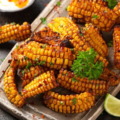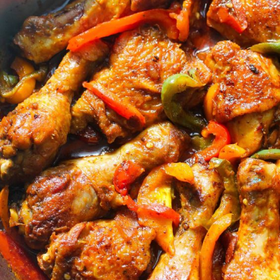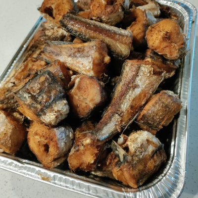 Fried plantain, fried yam, fried potatoes, peppered turkey, peppered chicken, and corn on cobs (feeds 6)