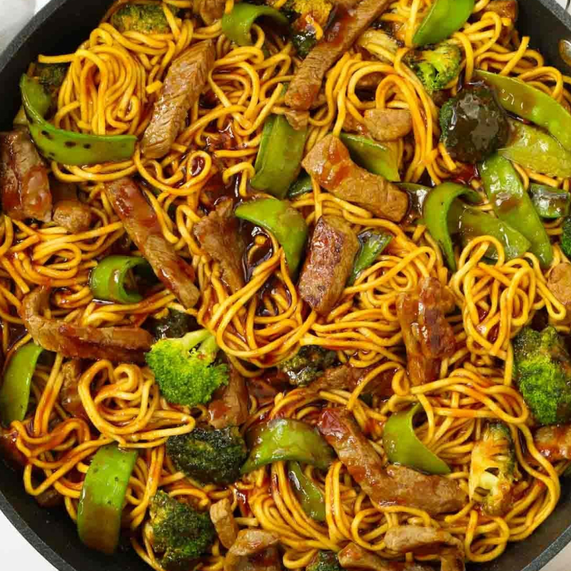Noodles stirfry with chicken/ beef suya with veggie omelette and sausage