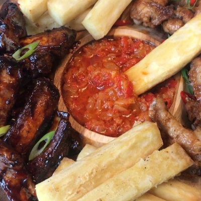 Fried plantain, fried yam, fried potatoes, peppered turkey and pepper sauce (feeds 2)